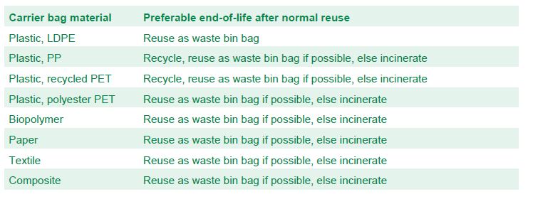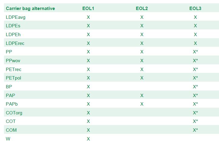 W niniejszym badaniu założono, że najlepszą drogą po użyciu siatki będzie jej kolejne wykorzystanie, następnie recykling w przypadku ciężkich toreb (PP, PET, poliestrowa) lub użycie jako torby na śmieci w przypadku lekkich (LDPE, papier, bioplastik). Jeżeli użycie jako torby na śmieci jest niemożliwe ze względu na niską wytrzymałość na rozdarcie lub przemoknięcie (papier, bioplastik), to zakładane było spalenie torby. Analiza obejmowała wszystkie drogi zakończenia cyklu życia danego wyrobu, także w raporcie można poczytać jaki wpływ będzie miało spalenie torby a jaki wpływ jej recykling.