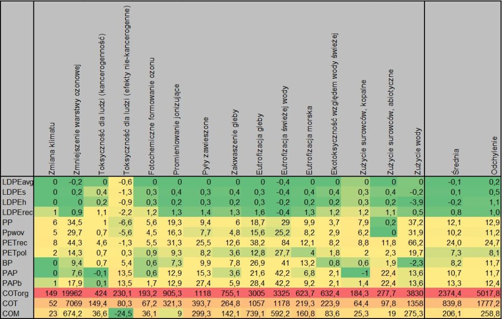 Czynników tych jest sporo, więc nikt nie może zarzucić badaniom, że zostały przeprowadzone jednowymiarowo. Badania zostały przeprowadzone wykorzystując model LCA o nazwie EASETECH [2]. Nie chciałbym wchodzić głębiej w metodologię, gdyż jest ona dość rozbudowana. Gruntowne przebadanie zaledwie 3 produktów zajęło autorom ponad 100 stron, w związku z czym skupię się na wynikach badania i komentarzu. Na Rys. 6 przedstawiłem tabelę zawierającą konieczną liczbę użyć worka, aby mieć taki sam wpływ na środowisko jak użycie jednej torby LDPE, która następnie zostanie spalona (wg badaczy takie rozwiązanie jest najbardziej ekologiczne). Pod tabelą są podane oznaczenia poszczególnych materiałów.