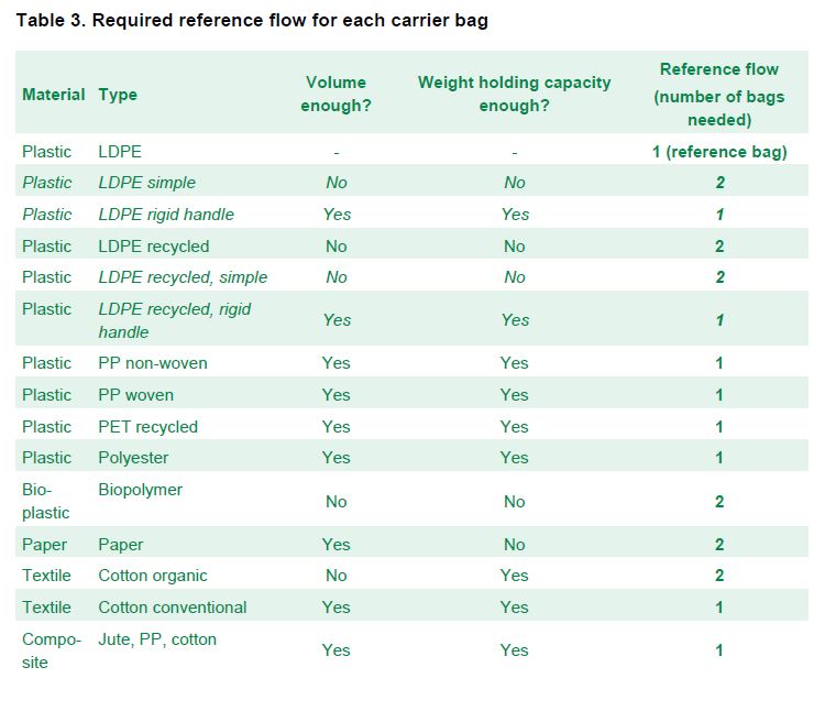 W modelowaniu założono, że torby muszą być w stanie przenieść ładunek o objętości 22 litrów oraz masie 12 kg. To spowodowało, że w przypadku m.in. papieru, bioplastiku torby bawełnianej z bawełny ekologicznej należałoby wykorzystać 2 torby zamiast jednej. Jest to niefortunne wybranie objętości w przypadku torby bawełnianej, ponieważ torby te cechują się bardzo dobrą wytrzymałością. W przypadku papieru i bioplastiku jest to wytrzymałość graniczna, więc dla nieco mniejszej masy ładunku wyniki byłyby lepsze. W dalszej analizie przy tabelach będą dopisywać, ze należy rozważyć podzielenie uzyskanych wartości przez 2 (ja osobiście robiłem lub sugerowałem).