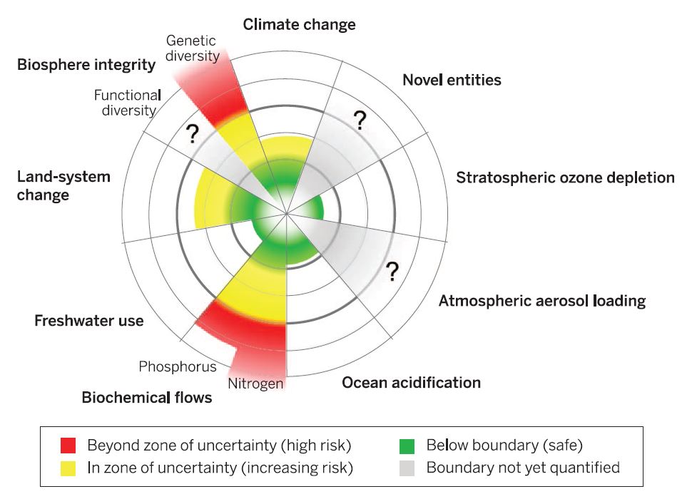 Spotkałem się z uwagą, że przecież można pominąć dziurę ozonową, bo nie jest to największy czynnik[3]. Mam pewne wątpliwości co do konkluzji tegoż komentarza, jednak zwrócił on uwagę na dość istotną sprawę. Autor tego tekstu powołuje się na artykuł w czasopiśmie Science, gdzie badacze wskazują, że problem dziury ozonowej już nie jest tak ważny[4]. Autorzy wskazali, że dużym ryzykiem zaburzeń ze strony aktywności ludzi cechują się obszary różnorodności genetycznej oraz przepływy biochemiczne fosforu i azotu. Do tego dochodzą zmiany w układach środowiskowych na ziemi. W przypadku wody pitnej na ten moment nie mamy jeszcze problemów, podobnie jak zakwaszenie oceanów. Nie ma jeszcze wyników badań dot. aerozoli w powietrzu oraz różnorodności funkcjonalnej w środowisku (ten ostatni czynnik nie jest brany pod uwagę).