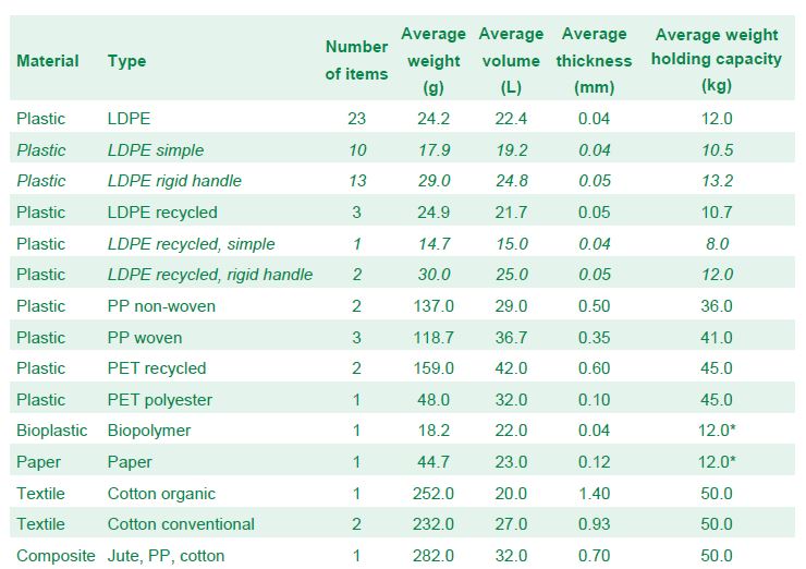 W oparciu o zebrane dane autorzy przygotowali zestawienie średniej gramatury, objętości, grubości oraz udźwig toreb.
